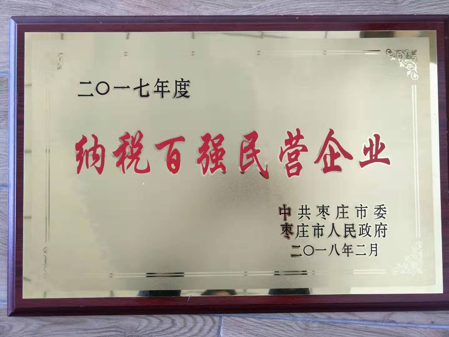 The company's 2017 Zaozhuang City "Top Ten Water-saving Units" title plaque